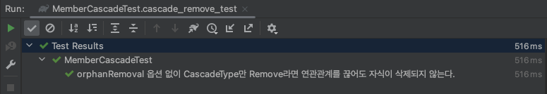 반면 orphanRemoval = true 옵션을 준 경우는 진짜로 자식이 삭제됩니다. 정리해 보면 양쪽 모두 부모가 삭제될 때 함께 삭제되는 것은 맞지만 orphanRemoval 옵션을 주지 않는다면 단순히 연관관계를 끊었다고 해서 자식 엔티티가 삭제되지는 않는다. 입니다.