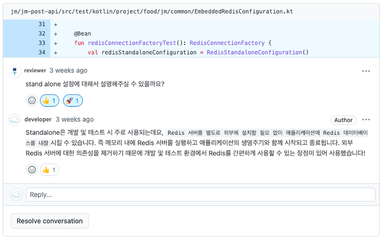 나는 이 코드를 작성했기 때문에 코드의 의도, 로직을 명확히 알지만 리뷰어는 문맥 파악이 되지 않은 상태 입니다. 따라서 해당 코드(혹은 개념)에 대해 가급적 상세히 답변 합니다.