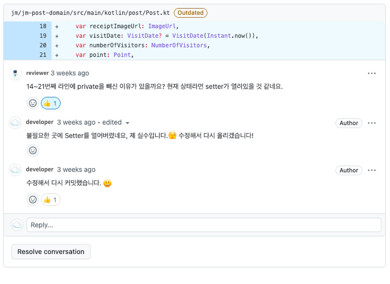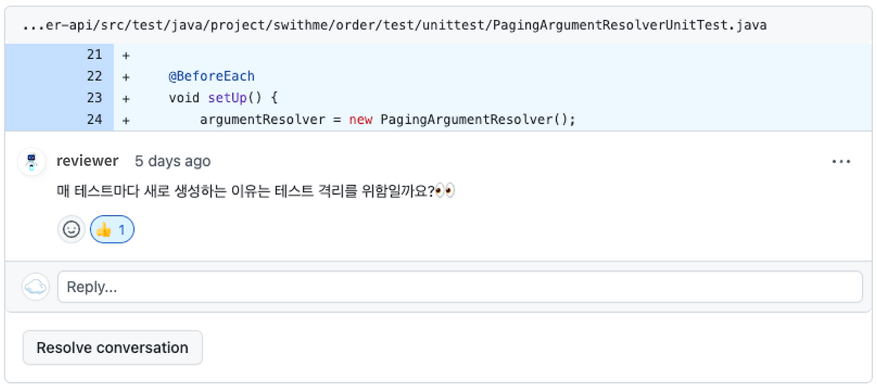 또한 리뷰를 주고 결론을 맺지 않으면 코드 리뷰를 받는 사람이 혼란스러울 수 있으므로 자신만의 결론을 내릴 수 있도록 항상 끝맺음을 지어줍니다.