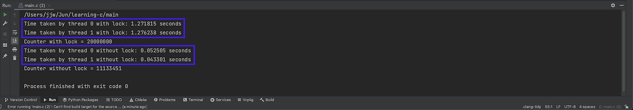printf("Time taken by thread %ld without lock: %f seconds\n", index, results[index]->time_taken);