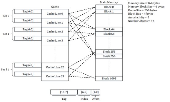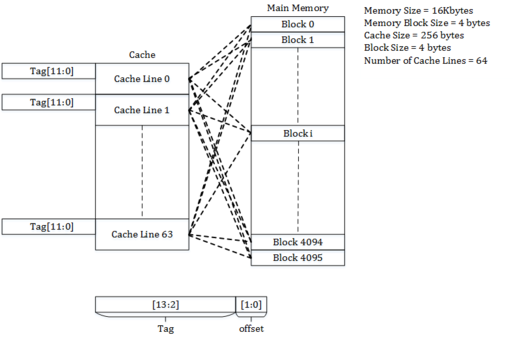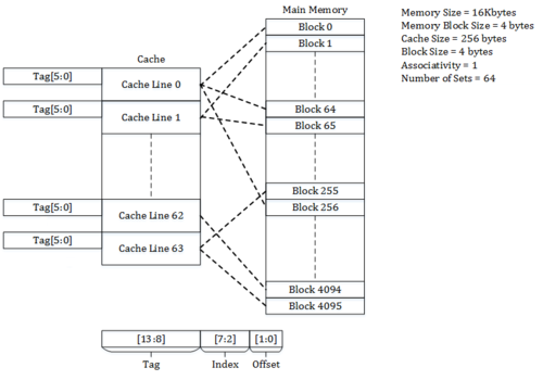 메모리 주소는 태그, 캐시 인덱스, 바이트 오프셋의 세 부분으로 나뉘어 처리됩니다. 캐시 인덱스는 주소 내에서 해당 데이터가 캐시의 어떤 위치에 저장될지 결정하는 부분이며, 태그는 저장된 데이터가 찾고자 하는 데이터와 일치하는지 확인하는 부분입니다. 주소의 태그 부분이 캐시 라인의 태그와 일치하면 캐시 히트가 되며, 그렇지 않으면 캐시 미스로 처리됩니다.