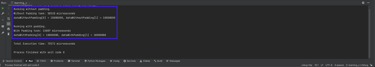 이를 실행하면 다음과 같은 결과가 나타납니다. 이는 CPU 캐시가 데이터를 캐시 라인 단위로 읽어오는 방식과 유사합니다. 즉 한 행의 데이터에 순차적으로 접근하면 이는 연속적인 메모리 위치에 접근해 데이터를 읽어오기 때문에 읽기 속도가 빠릅니다. 반면 열을 기준으로 배열에 접근하면 메모리상에서 서로 떨어진 위치들을 참조하게 되며, 이런 접근이 자주 발생하면 캐시 미스로 캐시 데이터가 빠르게 쫓겨납니다.