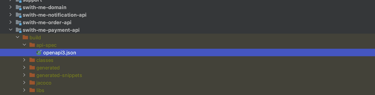 yml/json를 생성하기 위해 build 과정에 포함시키면, 즉 openapi3 Task를 build에 포함시키면 빌드 과정에서 각 모듈마다 다음과 같은 yml 또는 json 파일이 생성되며, 이렇게 생성된 yml/json을 Swagger로 보여주면 됩니다.
