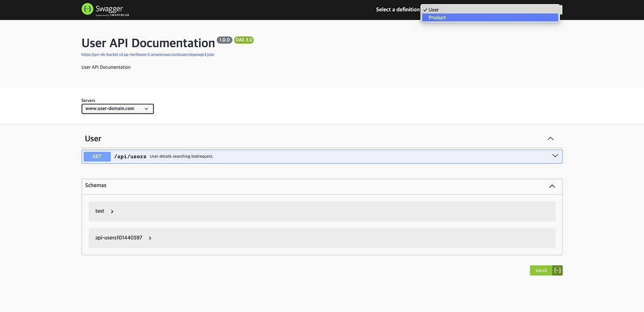마지막으로 이렇게 추출된 API 스펙을 어떻게 보여줄지가 남았는데, 이는 각 모듈의 API 스펙을 한곳으로 모으고 Swagger에서 해당 저장소를 바라보도록 해주면 됩니다. Swagger에서는 yml/json으로 API 문서를 생성할 수 있기 때문입니다.