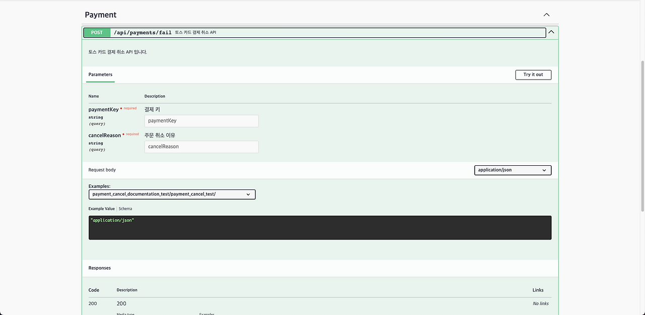 아직 Swagger와 RestDocs의 완벽한 호환을 지원하지 않기 때문에 Swagger에 RestDocs의 스펙을 반영하지 못하는 부분이 존재합니다. 예를 들어 POST 요청에서 RequestBody의 값을 Swagger에 반영할 수 없습니다. 이런 부분은 어느 정도 감수하거나, RestDocs를 제공해 상세 스펙을 명시해 줘야 합니다.