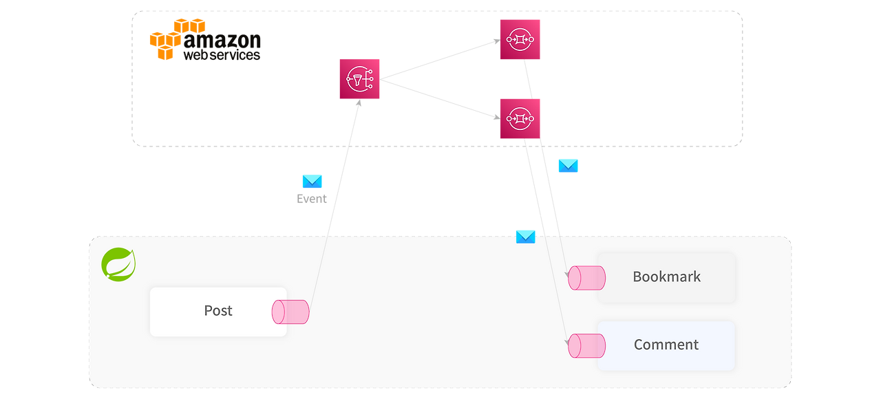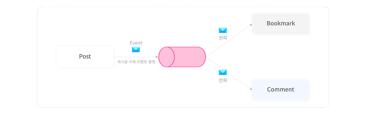 예를 들어, 게시글이 삭제되면 게시글에 달린 댓글, 북마크, 이미지가 함께 삭제돼야 합니다. 따라서 게시글 삭제라는 이벤트가 발행되면, 해당 이벤트는 댓글, 북마크 등과 같은 다른 도메인에 영향을 미치게 됩니다.