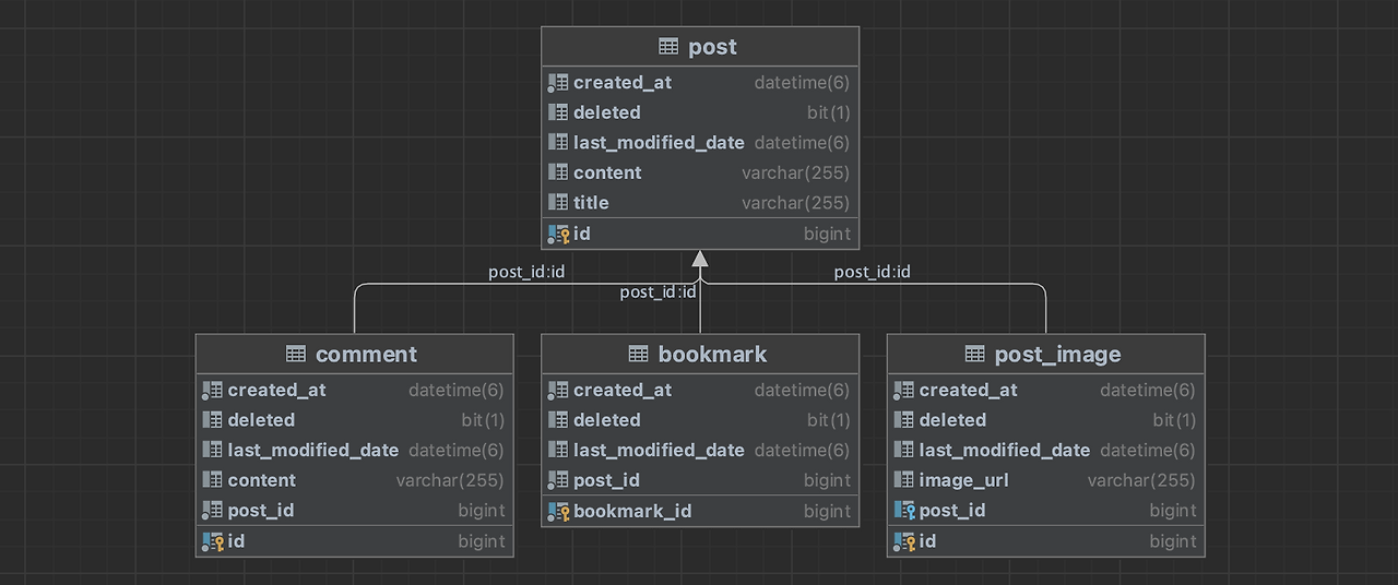 이번 글에서 사용할 예제의 테이블 구조는 다음과 같습니다. 하나의 게시글에는 여러 개의 댓글, 북마크, 게시글 이미지가 있습니다. 즉, 게시글과 댓글, 북마크, 이미지는 일대 다의 관계입니다. 이를 토대로 이벤트를 어떻게 사용해야 하는지 살펴보겠습니다.