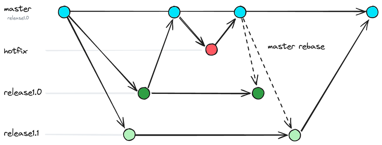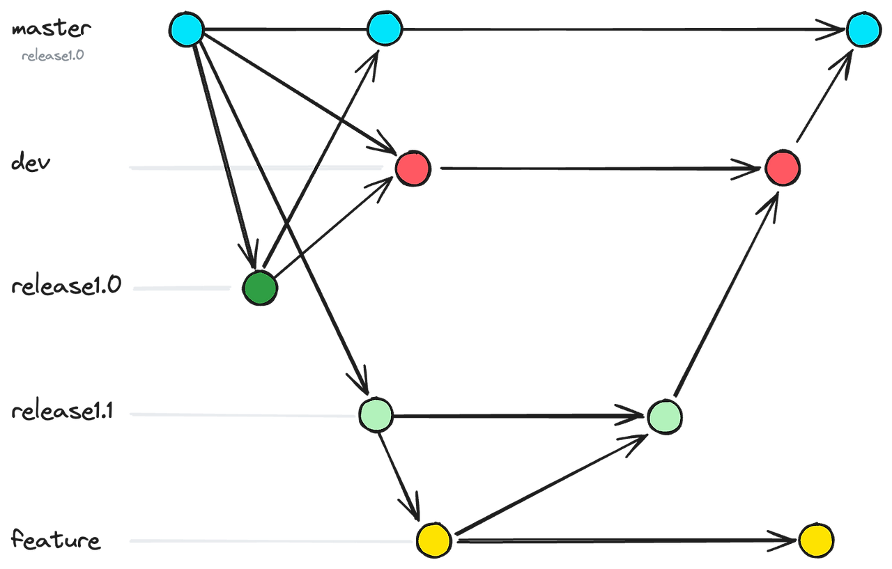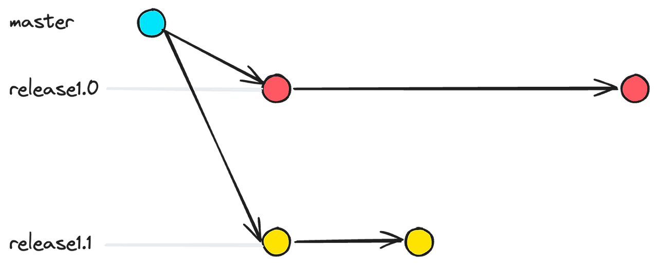 이 전략을 사용하면 hotfix를 반영한 코드, 즉 master의 최신 코드를 v1.0과 v1.1에 모두 반영할 수 있습니다. 또한 dev 브랜치로 코드가 합쳐지기에, v1.0을 또한 개발 서버에서 테스트해 볼 수도 있습니다. dev, v1, v2 모두 master로 부터 파생되었기 때문이죠.