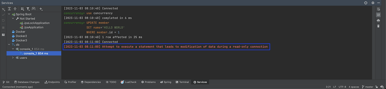 해당 설정 후 쓰기 작업을 하면 다음과 같이 오류가 나는 것을 볼 수 있습니다.