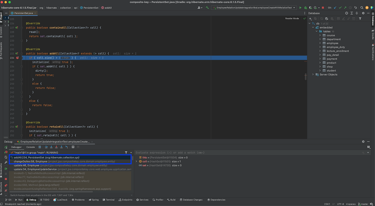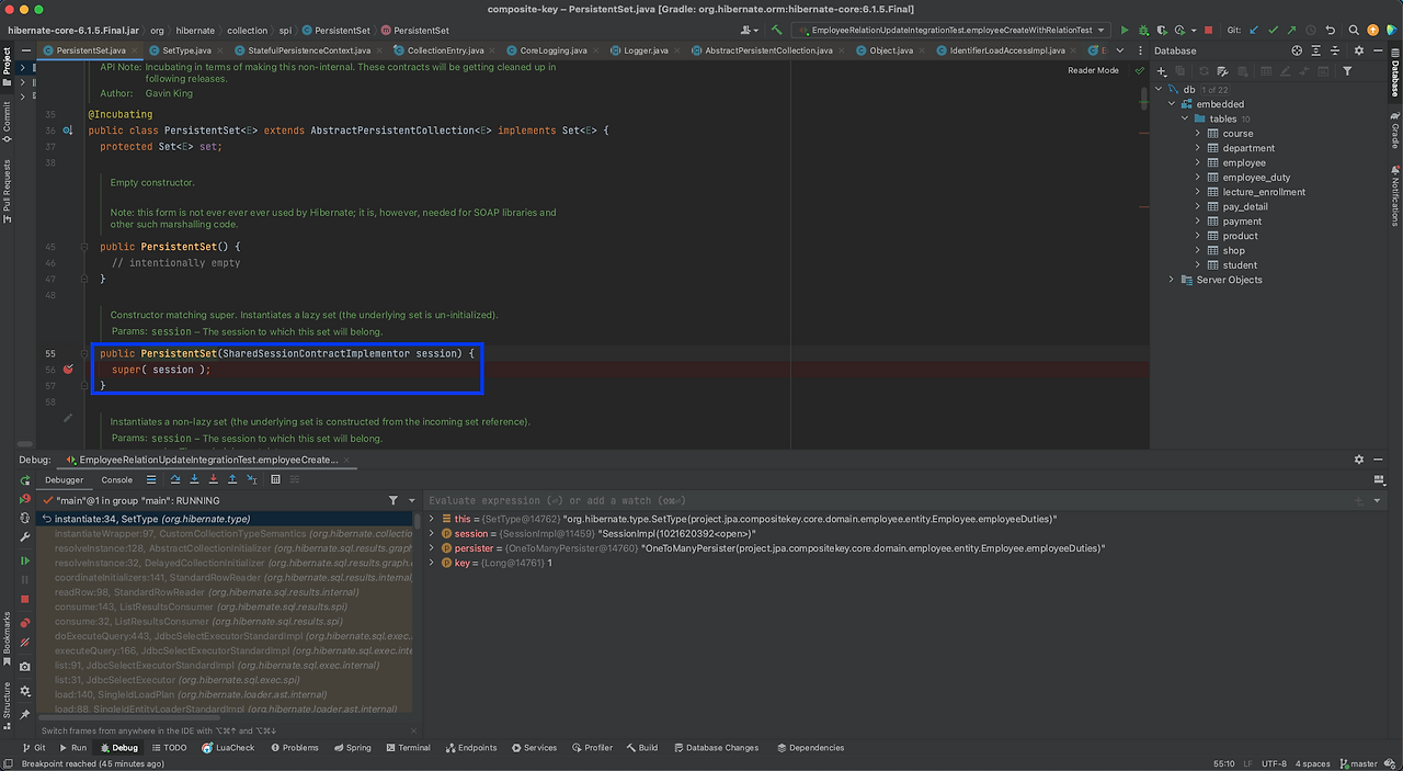 위에서 Employee 엔티티가 맺었던 연관관계를 다시 한번 살펴보면, Employee에서 EmployeeDuty를 Set으로 가지고 있습니다. 이는 겉보기에는 자바의 Set 구조이지만, 사실 PersistentSet으로 감싸진 상태입니다.