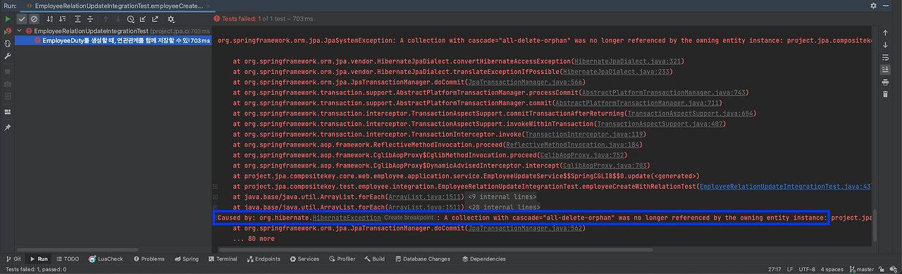 이는 다음과 같이 JpaSystemException이 발생하게 됩니다. 회사에서 만난 에러와 똑같은 에러로, 문제 상황이 정확하게 재현되었습니다. 이제 다음으로 어떻게 이를 해결하는지에 대해 살펴보겠습니다.