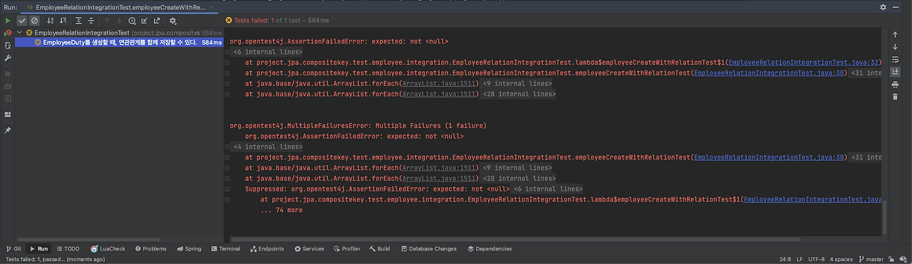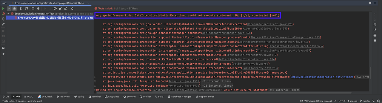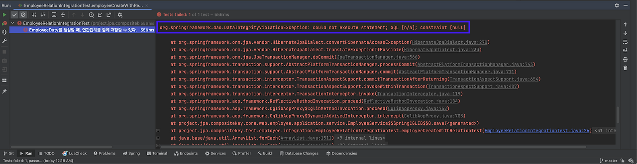 이를 테스트하면 다음과 같은 에러가 나는 것을 볼 수 있습니다. DataIntegrityViolationException 에러로, 실제 회사에서 겪었던 것과 똑같은 에러입니다. 데이터베이스가 MySQL이라 에러 메시지는 다르지만, 발생한 에러는 정확히 재현됐는데, 이는 Department 엔티티(외래키)가 저장되지 않았기 때문입니다.