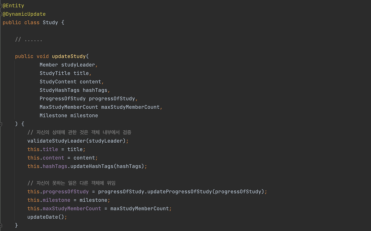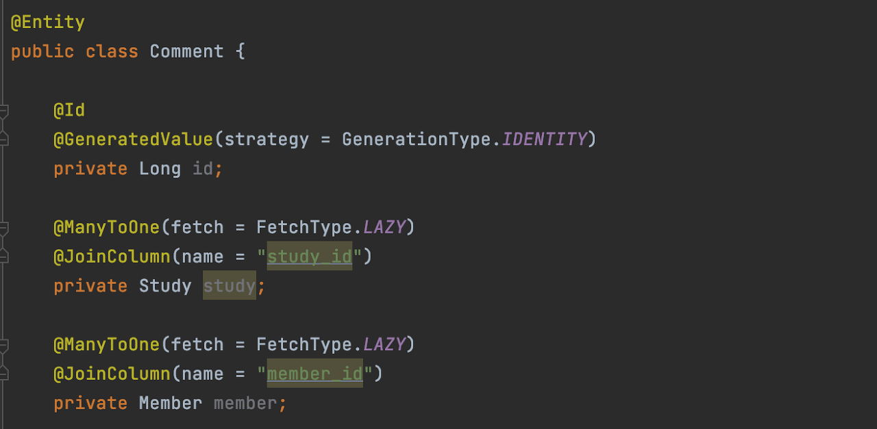 세 번째 장점은 객체지향적 사고를 할 수 있다는 점입니다. 개인적으로 이 부분이 가장 큰 장점이라고 생각되는데, JPA에서 엔티티는 반대편 테이블의 외래키를 나타냅니다. MyBatis나 Jdbc 템플릿을 사용하면 외래키가 Integer, Long 등의 단순 값이지만 JPA에서는 객체가 되기 때문에 객체끼리 소통/협력을 할 수 있게 됩니다.