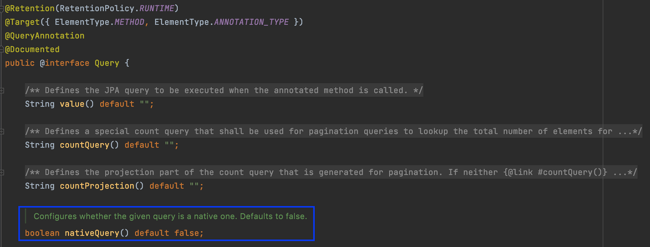 또한 Native Query가 필요할 경우 @Query 어노테이션의 nativeQuery 설정을 통해 직접 SQL문을 작성할 수도 있습니다.