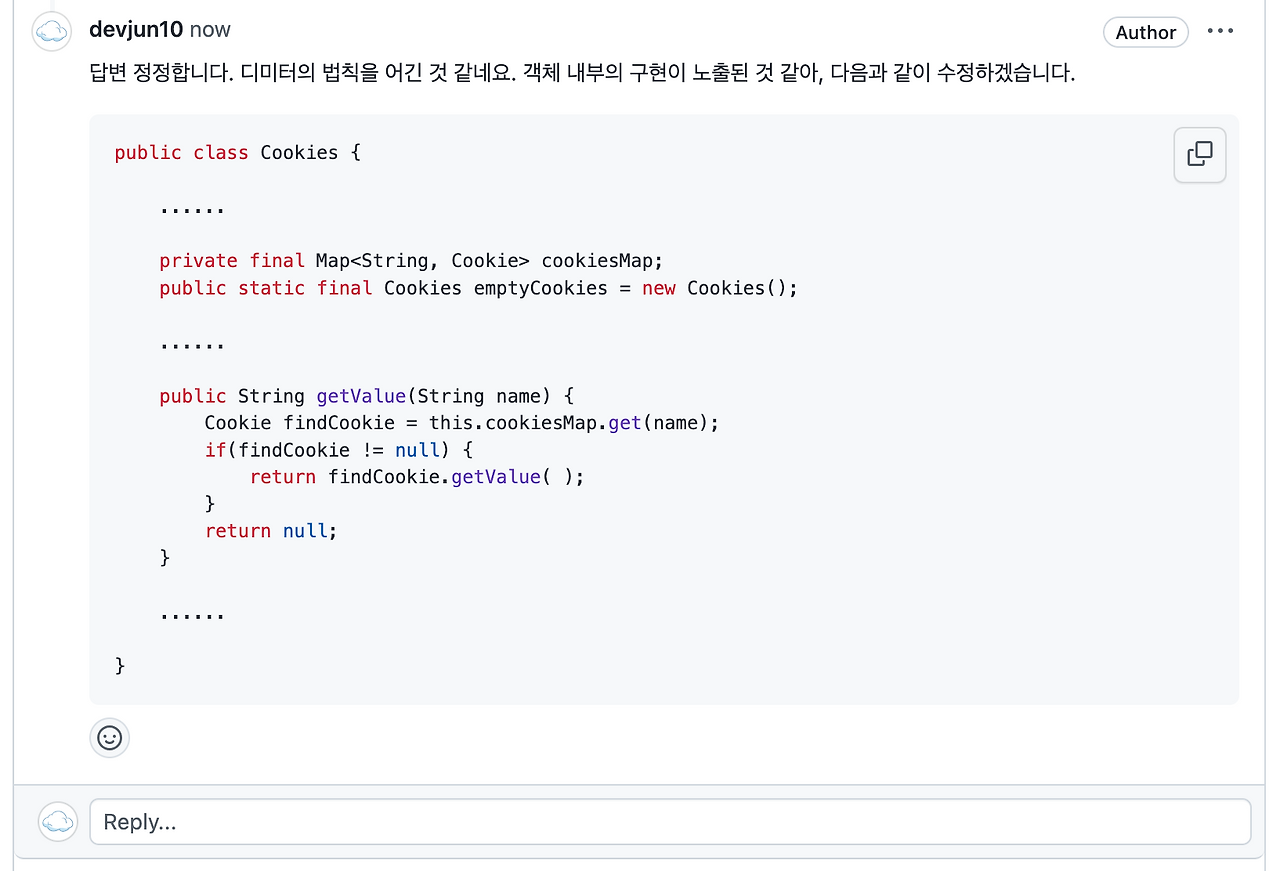 같이 프로젝트를 진행하던 MU가 디미터의 법칙에 대해 질문을 했는데, 다음과 같이 답변을 달았습니다. 디미터의 법칙은 객체의 캡슐화, 결합도에 관한 것이 핵심인데 문맥 이라는 잘못된 방향의 답변을 한 것입니다.