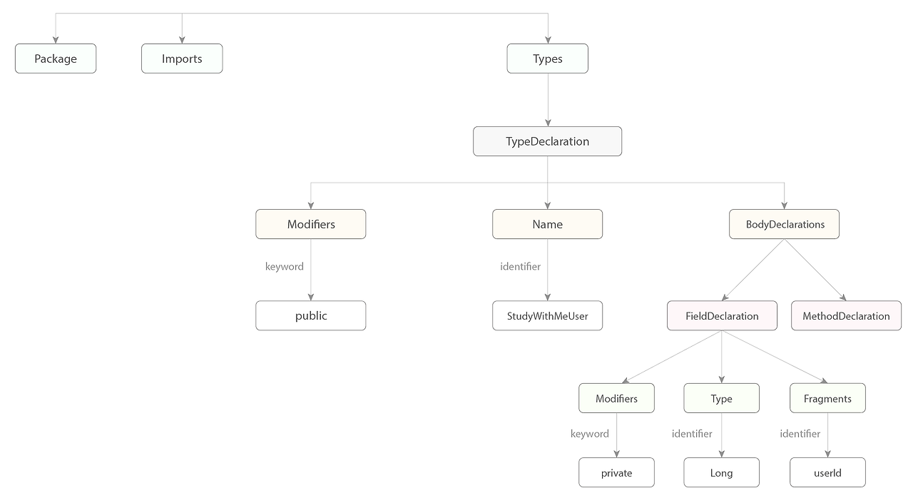 AST를 보면 다음과 같은데요, 우리가 작성한 클래스 파일이 갈래로 나뉘어 분류된 것을 볼 수 있습니다.