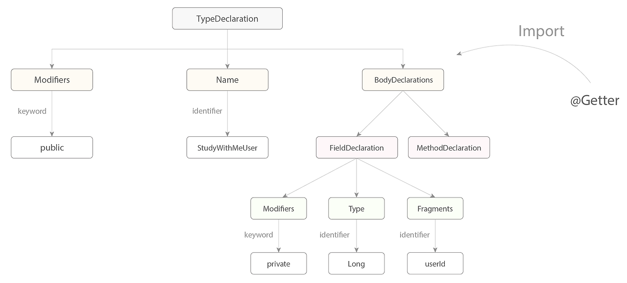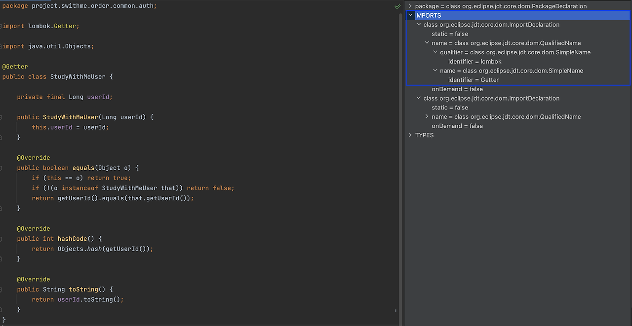 그러면 Imports에 아까는 없던 롬복 관련 Import가 생긴걸 볼 수 있는데요, 즉 롬복의 메서드를 가져와서 AST에 붙이는 것입니다. 트리를 보면 @Getter에 대한 Imports가 생긴 것을 볼 수 있습니다.
