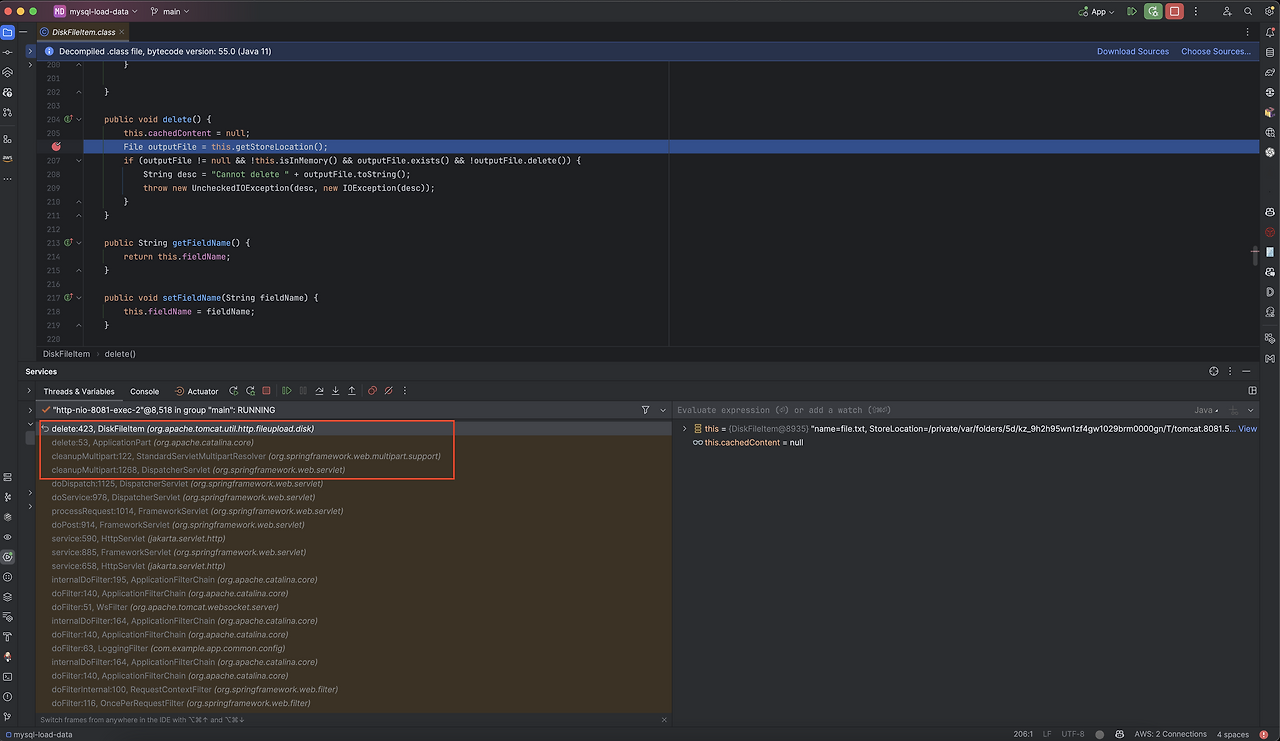 이는 Request 클래스 내부를 보면 알 수 있는데요, 다음과 같이 jakarta.servlet.context.tempdir 경로에 임시 파일을 저장하는 것을 볼 수 있습니다. 이 디렉터리는 톰캣이 시작될 때 생성되어 종료될 때까지 유지되며, 업로드된 임시 파일은 HTTP 요청이 종료되는 시점에 자동으로 삭제 됩니다.