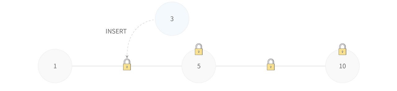 이를 그림으로 보면 다음과 같은데, 각 인덱스 사이에 락을 걸어 다른 데이터의 삽입을 막습니다.