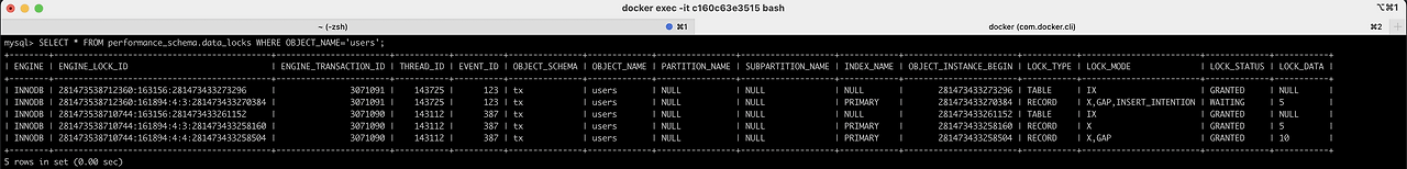 mysql> SELECT * FROM performance_schema.data_locks WHERE OBJECT_SCHEMA = 'tx' AND OBJECT_NAME = 'users';