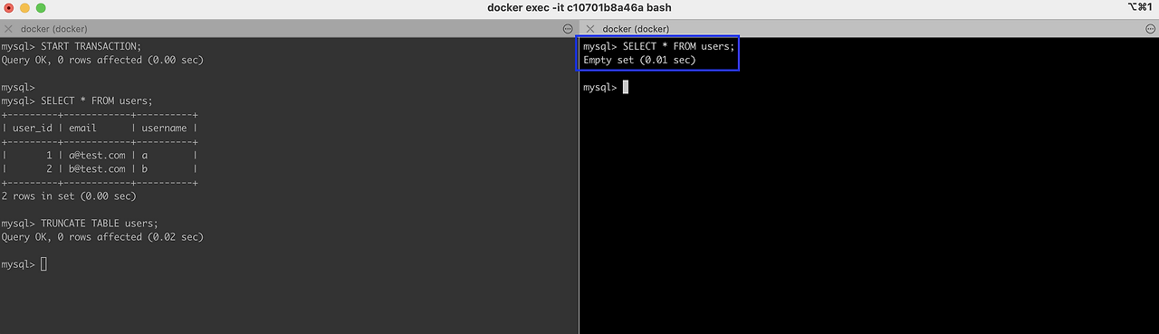 이후, 새로운 shell 창을 열어서 다른 트랜잭션 에서 데이터가 삭제되었는지 조회해보겠습니다. 아직 왼쪽 창에서 커밋을 하지 않았는데도 데이터가 없는 것을 볼 수 있는데요, 즉, 암묵적 커밋 발생, 격리 수준과 무관하게 즉시 반영 된 것을 알 수 있습니다.