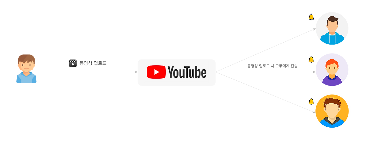 반면 풀 모델은 주체가 최소한의 정보만을 전달하고 감시자가 다시 상세 정보를 요청합니다. 주체가 감시자를 몰라도 되지만 감시자 클래스가 주체 클래스와 상관 없이 무엇이 변했는지를 확인해야 하기에 비효율적일 수 있습니다. 예를 들어 유튜브에서 특정 인플루언서의 새로운 동영상 업로드에 대해 구독자들에게 알림을 보낸다고 가정해보겠습니다. 이때 구독자가 접속했을 경우에만 새로운 동영상에 대한 알림을 받도록 하는 것입니다. 즉 실제 접속하지 않거나, 장기간 접속하지 않은 사용자들에게 알림을 보낼 필요가 없어 비효율적인 메시지 전송을 막을 수 있습니다.