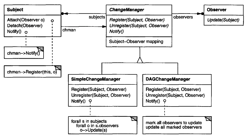 여기서 더 나아가 복잡한 갱신의 의미 구조를 캡슐화할 수도 있습니다. 주체와 감시자 간 일어나는 관련성이 복잡하다면 이들 관련성을 관리하는 별도의 객체를 만드는 것입니다. 이 객체는 감시자가 처리해야 하는 주체의 변경 처리를 최소화하는 것입니다. 이를 다이어그램으로 보면 다음과 같습니다.