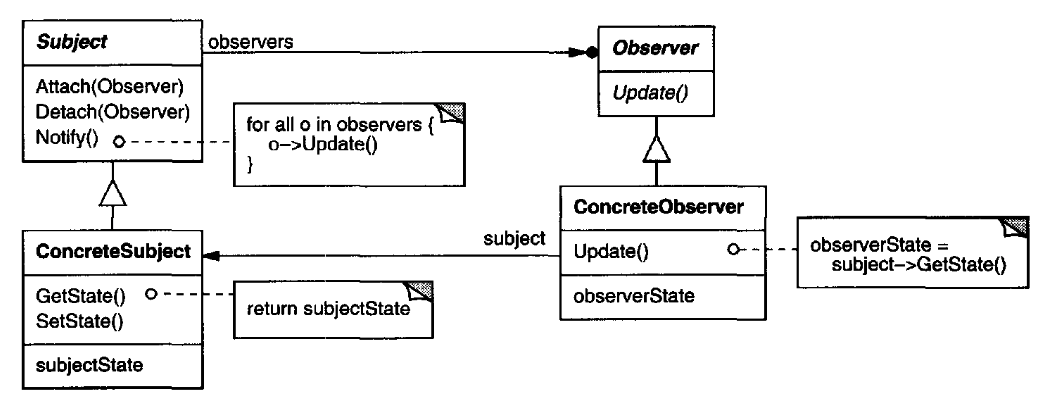 여기서 푸시 모델(Push Model)과 풀 모델(Pull Model)을 고려할 수 있는데, update( ) 연산의 주최를 누가 가져가는지에 대한 것입니다. 푸시 모델에서 주체는 감시자의 요청이 무엇인지 알아야 하며, 자신의 변경에 대한 상세한 정보를 감시자에게 전달합니다. 이를 사용하면 감시자 클래스의 재사용성이 떨어지는데, 주체 클래스가 감시자 클래스에 대한 어떤 가정을 하면 이것이 항상 맞지는 않기 때문입니다. 예를 들어 구독자에게 알림 중복 전송, 메시지 유실의 경우가 있습니다.