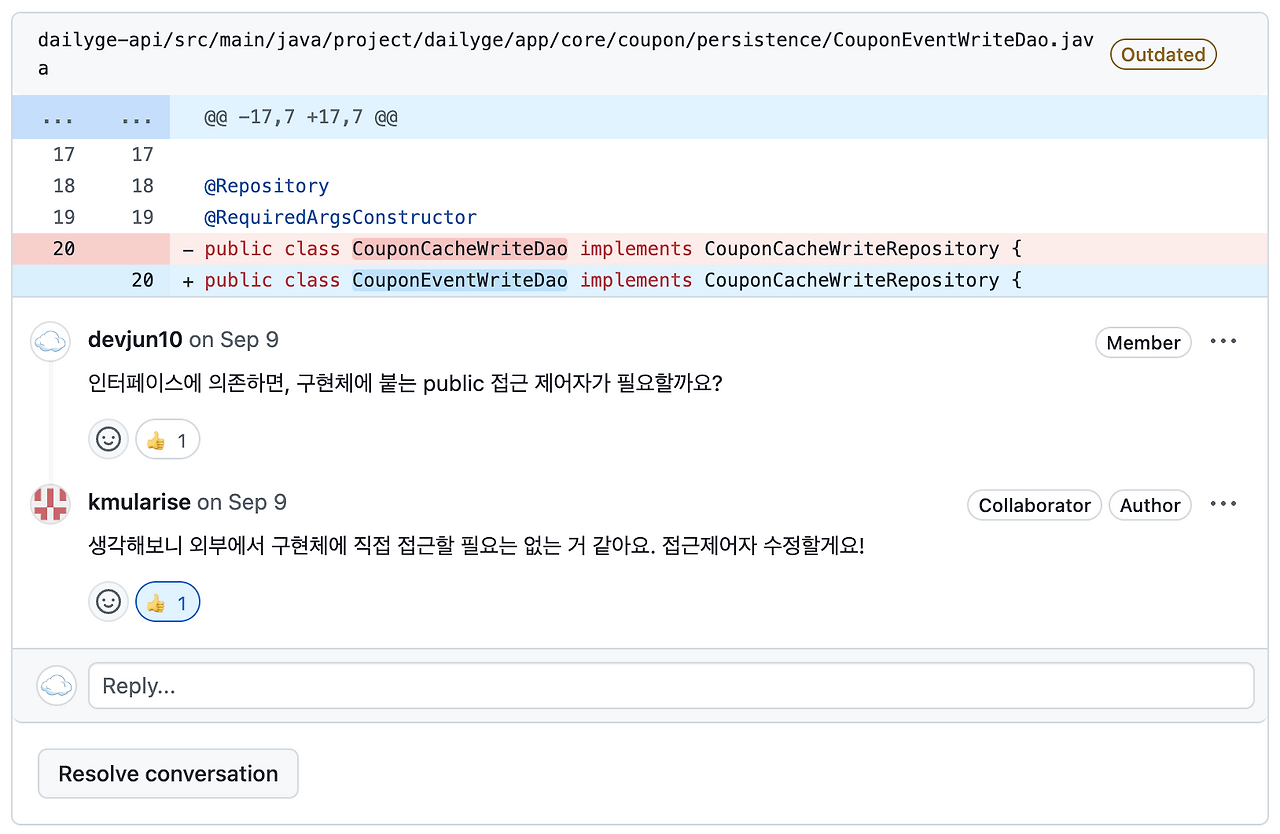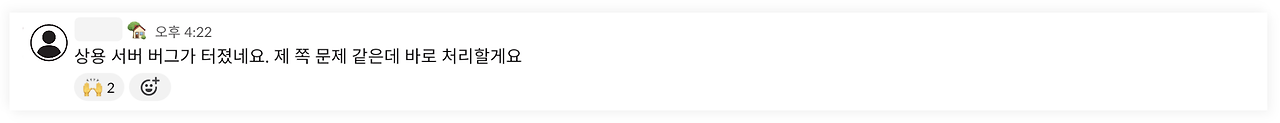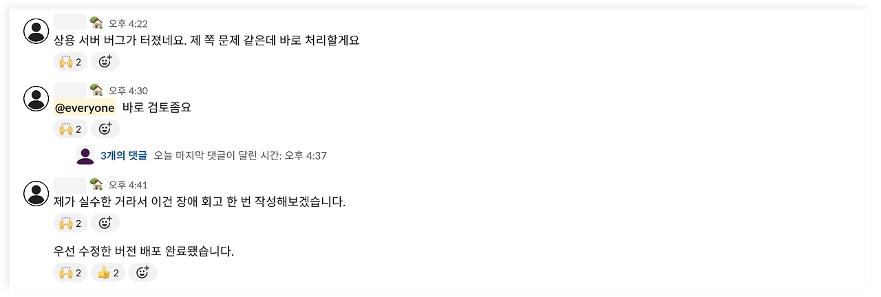 추가로 코드 리뷰 내용 에 대한 의견도 나왔는데요, 프로젝트에서 이미 코드 리뷰를 도입 하고 있었지만 그럼에도 장애가 발생 했기 때문입니다. 이전 코드 리뷰에서 코드 스멜이나 포맷에 대한 체크가 주를 이루었는데, 이것보다 버그 예방 과 코드를 더 꼼꼼히 보는 것 이 조금 더 필요할 것 같다고 솔직하게 의견을 냈습니다. 물론 그 전에 제가 꼼꼼히 봐야겠지만요. 🏃