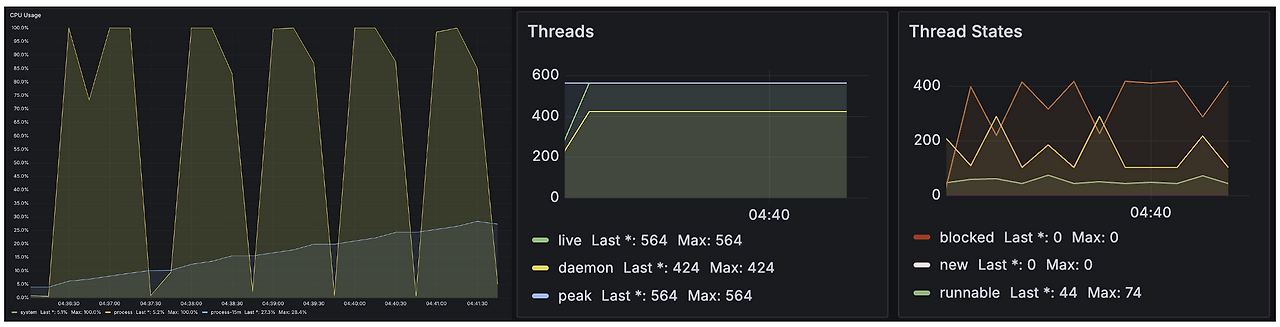 비슷한 상황이 스프링 애플리케이션과 RDB에서도 발생했는데요, 톰캣 쓰레드 개수를 너무 적게 잡다 보니 적은 쓰레드로 너무 많은 요청을 처리했고, 이 과정에서 CPU 사용률이 지속적으로 100% 가 되는 현상이 발생했습니다. 반대로 톰캣 쓰레드 개수를 너무 많이 늘린 후, RDB 커넥션 개수가 부족하기도 했고요. 따라서 서버 리소스를 지속적으로 체크하며 장애가 발생하기 전, 미리 대책을 세우도록 합시다.