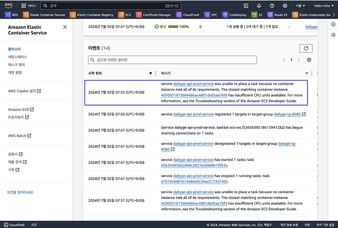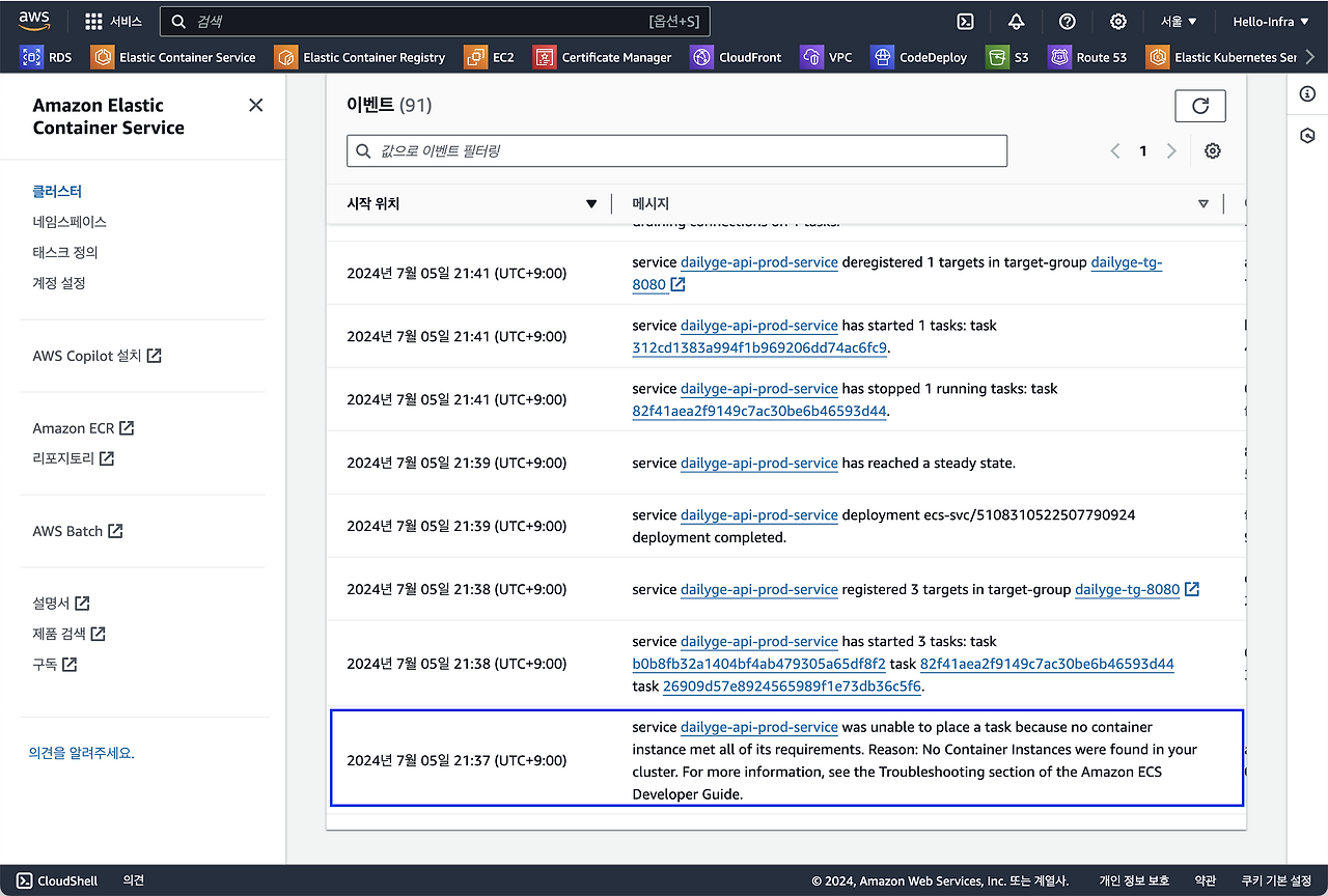 마지막으로 배포 전, 인스턴스가 존재하지 않아 발생한 이슈입니다. 이는 태스크를 실행해야 하는데, 컨테이너를 배포할 인스턴스가 존재하지 않아 발생한 문제입니다.