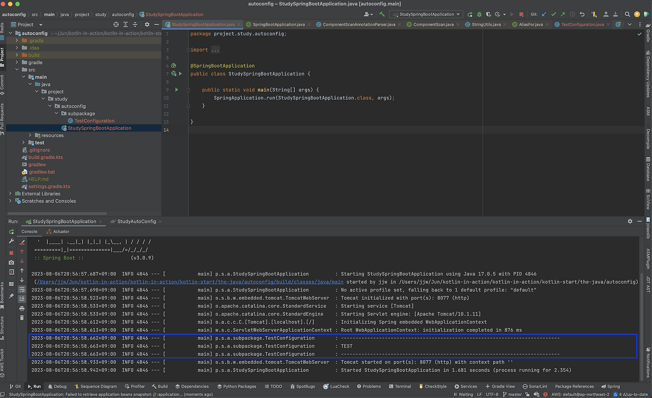 이는 @Configuration과 헷갈릴 수 있는데 그 차이점에 대해 간략히 살펴보겠습니다. 위에서 @Configuration을 확장한다고 설명했는데요, 이는 @Configuration의 기능을 포함합니다. 즉 해당 어노테이션이 붙은 클래스를 빈으로 등록해 줍니다. 이를 확인하기 위해 @SpringBootApplication이 붙은 클래스와 별개로 아래와 같은 클래스를 만든 후 애플리케이션을 실행시켜 보겠습니다.