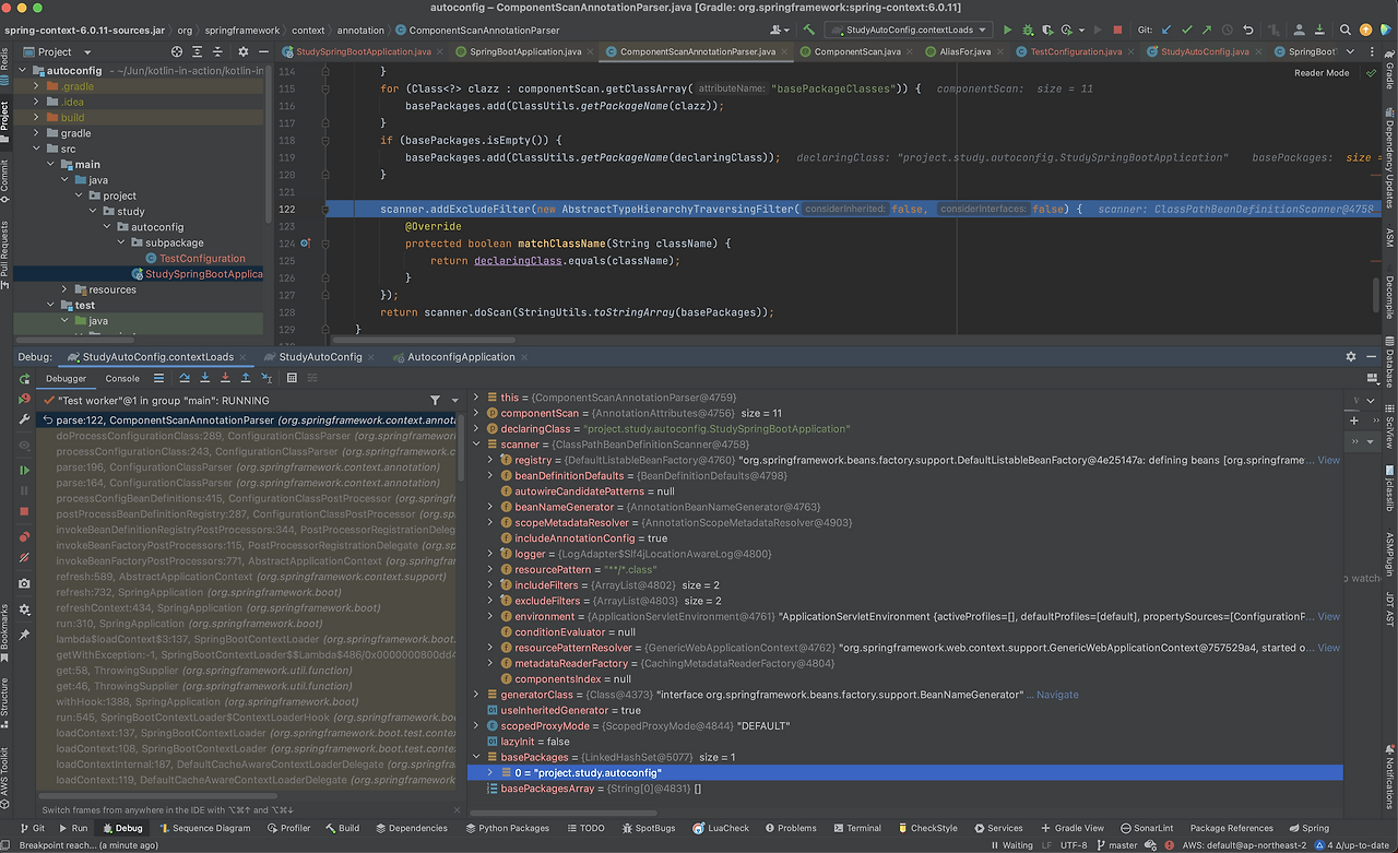 첫 번째 케이스를 알기 위해서는 어디서 basePackage를 읽는지 알아야 합니다. 스프링 부트에서 테스트가 실행되면 우선 @SpringBootConfiguation이 붙은 클래스를 찾아 context를 읽어옵니다. 이후 해당 클래스를 찾으면 ComponentScanAnnotationParser를 통해 basePackage를 찾습니다.