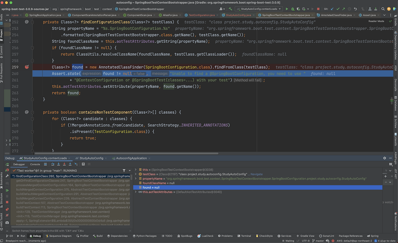 테스트에서 해당 어노테이션을 어디서 읽는지 한 번 살펴보겠습니다. 이는 SpringBootTestContextBootstrapper 클래스의 findConfigurationClass에서 context를 읽기 위해 사용됩니다.