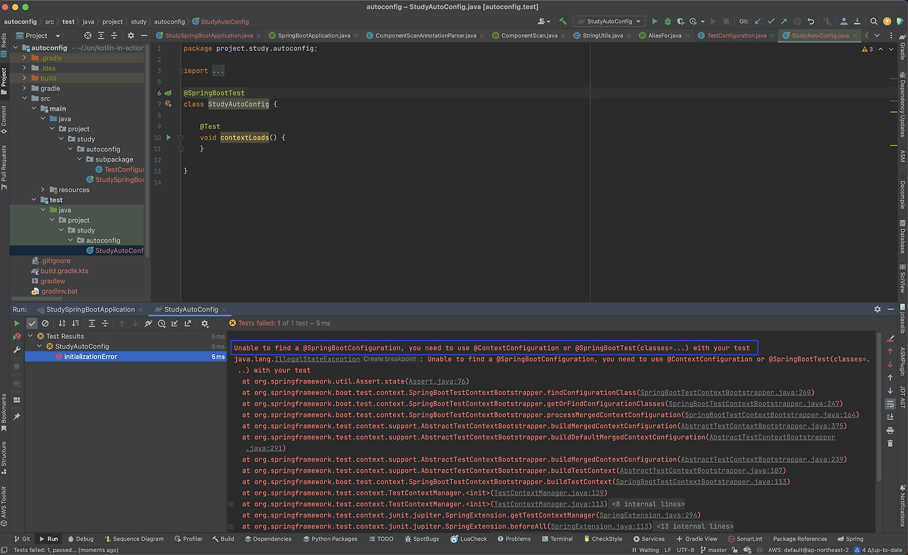 아래와 같이요. 따라서 @SpringBootApplication이 주석처리되면 테스트 자체를 돌릴 수 없습니다. @SpringBootConfiguration 어노테이션을 읽지를 못하니까요.