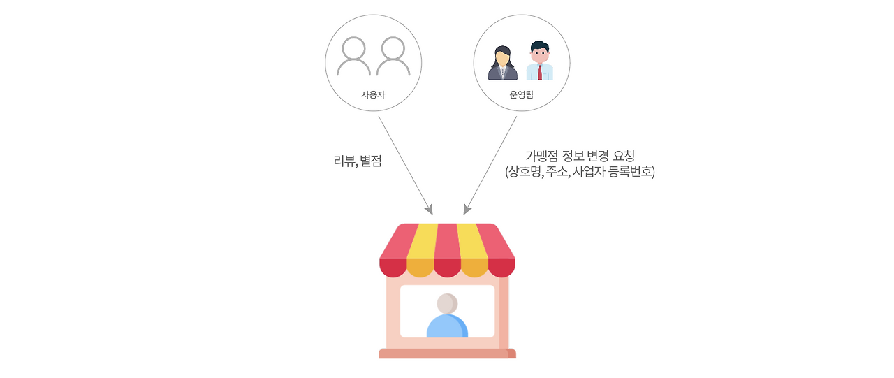 반면, 가맹점 평점이나 리뷰와 같은 정보는 외부 사용자가 직접 입력하거나 수정하는데요, 이때는 외부 고객이 액터가 됩니다. 물론 운영팀, 관리자 등 내부 직원도 액터구요.