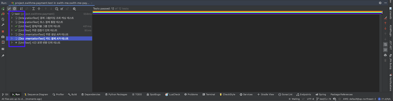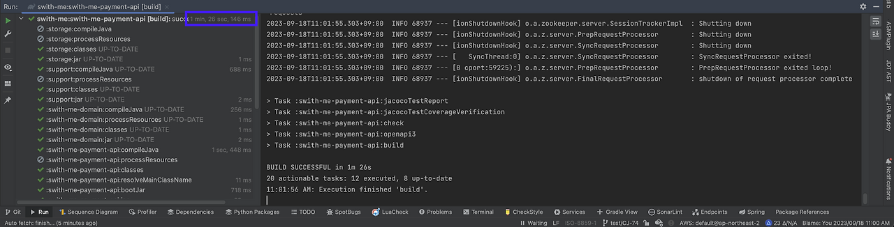 테스트컨테이너의 가장 큰 문제점은 실행 속도입니다. 아래는 약 15개 정도의 통합/문서화 테스트를 포함한 빌드한 시간인데, 1분 26초 정도가 나온 것을 볼 수 있습니다. 만약 테스트가 많아진다면 빌드 속도가 가파르게 증가합니다.
