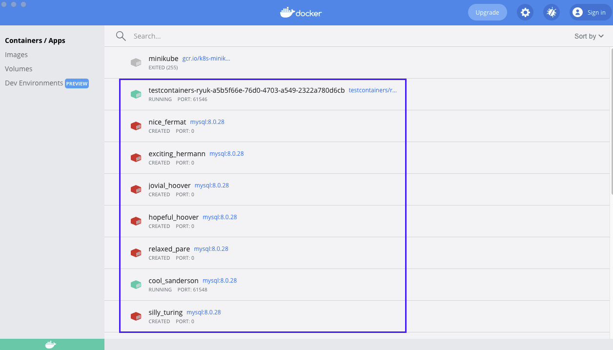 단, 단순히 병렬로 테스트를 실행하면 안 되는데, 아무런 조건 없이 이를 실행할 때 아래와같이 무수히 많은 테스트 컨테이너가 띄워지기 때문입니다.