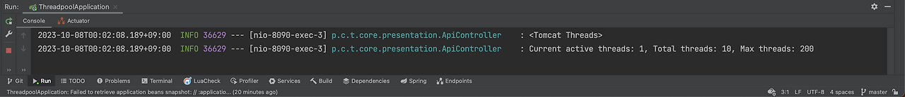 쓰레드 개수를 200개로 설정했지만 248개인 이유는, 쓰레드 풀 외에도 스프링을 구동하기 위한 다른 여러 쓰레드가 존재하기 때문입니다.