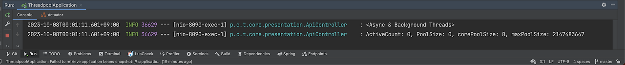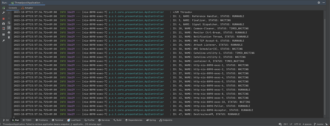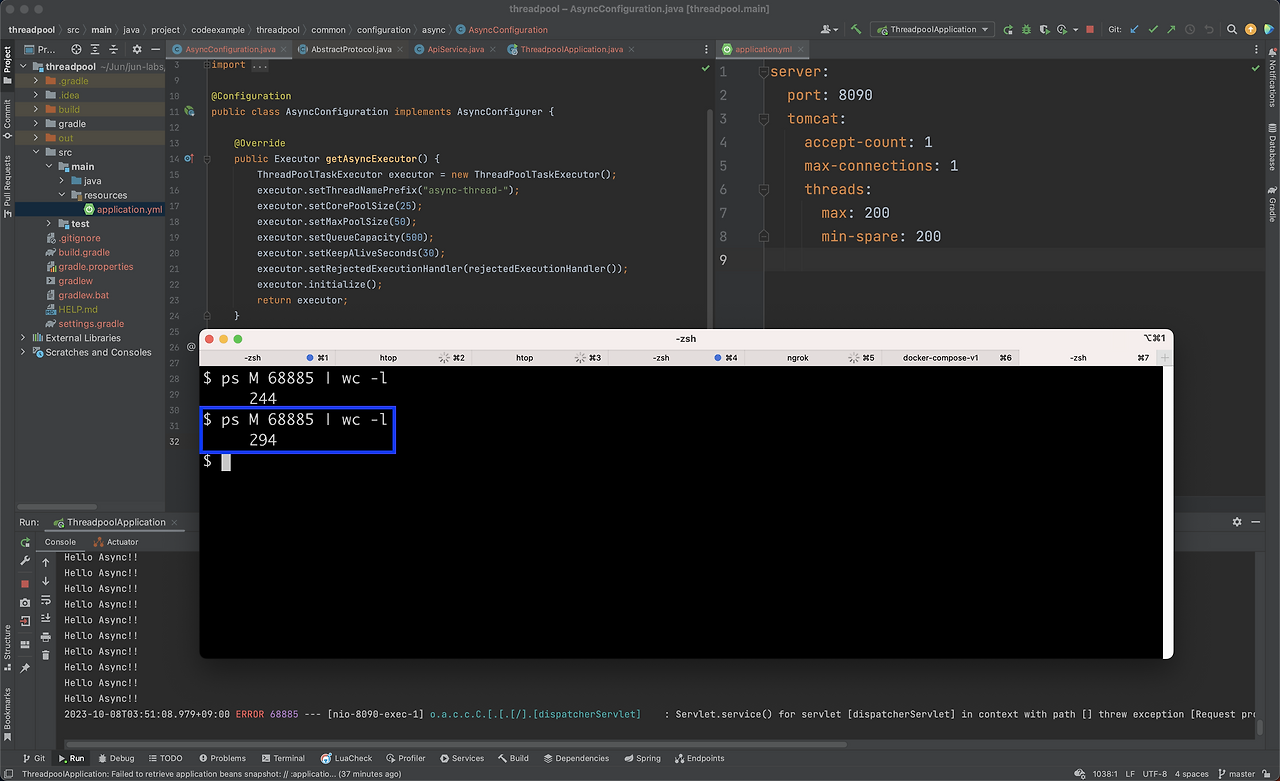API를 요청하고 난 후 쓰레드 개수를 살펴보면 294개로 늘어난 것을 볼 수 있습니다. 즉, 실제 비동기 요청이 온 시점에 쓰레드 풀의 개수를 늘려 이를 관리하는 것입니다.