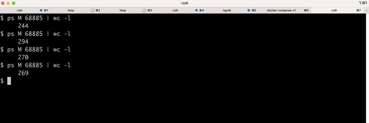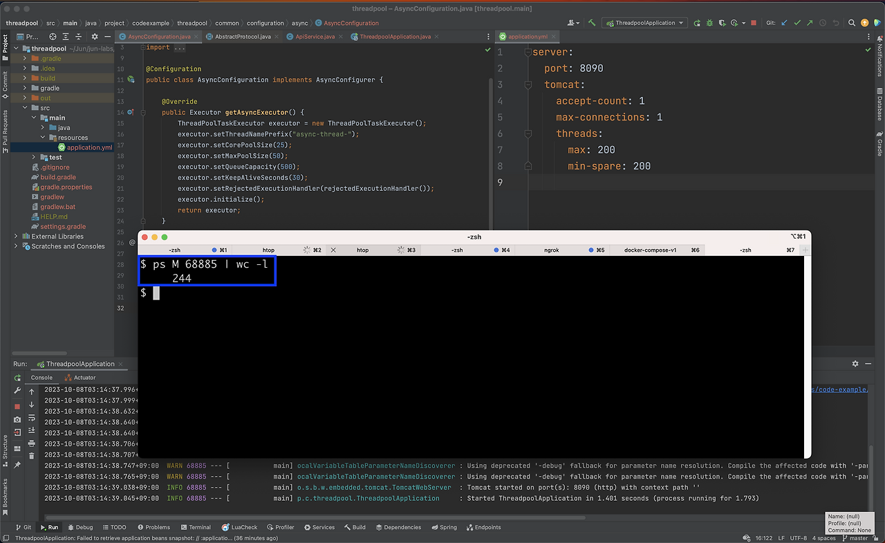 우선 application.yml로 설정하는 쓰레드 풀 개수만큼 실제 쓰레드가 생성되는지에 대해 살펴보겠습니다. 이를 위해서는 ps M 명령어를 알아야 하는데, 해당 명령어는 현재 프로세스에서 실행 중인 모든 쓰레드의 목록을 보여줍니다.