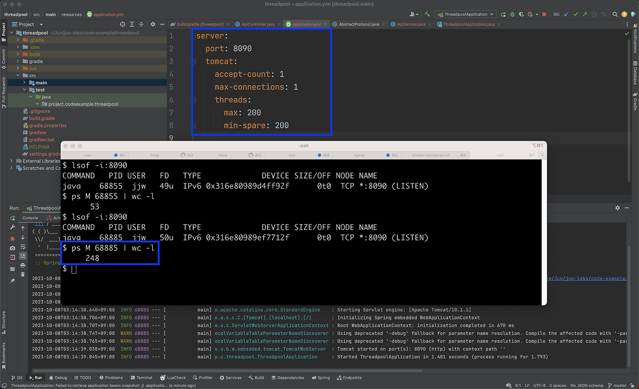 이를 200으로 변경하면 다음과 같이 쓰레드가 248개로 변한 것을 볼 수 있습니다. 즉, application.yml에 설정된 값만큼 스프링 내부에 쓰레드를 생성하며, 해당 개수만큼 커널에 쓰레드를 생성해 매핑하는 것입니다.