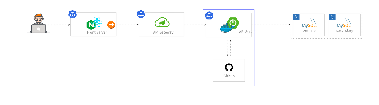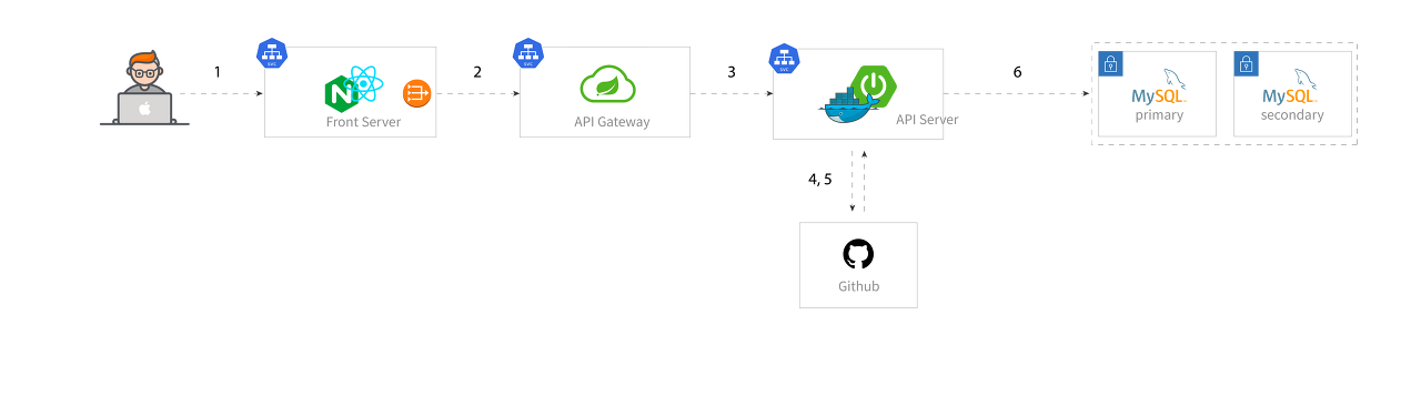 깃허브를 통해 회원가입하는 시나리오를 살펴보겠습니다. 사용자가 회원가입 요청(1)을 보내면 API Gateway(2)를 지나 API 서버(3)로 접근하게 됩니다. API 서버는 깃허브 서버로 요청을 보내 액세스 토큰을 받아오고(4), 해당 액세스 토큰으로 사용자 정보를 요청(5)합니다. 마지막으로 깃허브로 부터 받아온 사용자 정보를 데이터베이스에 저장(6)한 후 응답을 반환합니다.