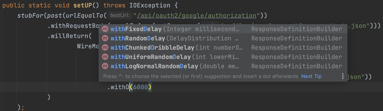 방법 자체는 간단합니다. 이전 글에서 Wiremock을 사용해 외부 API 대역을 스터빙 하는 방법에 대해 살펴보았는데요, 여기서 하나의 설정만 더해주면 됩니다. 아래와 같이 withFixedDelay를 지정해주면 데이터를 받아오는 과정에서 일정 시간만큼 딜레이를 시킬 수 있습니다.