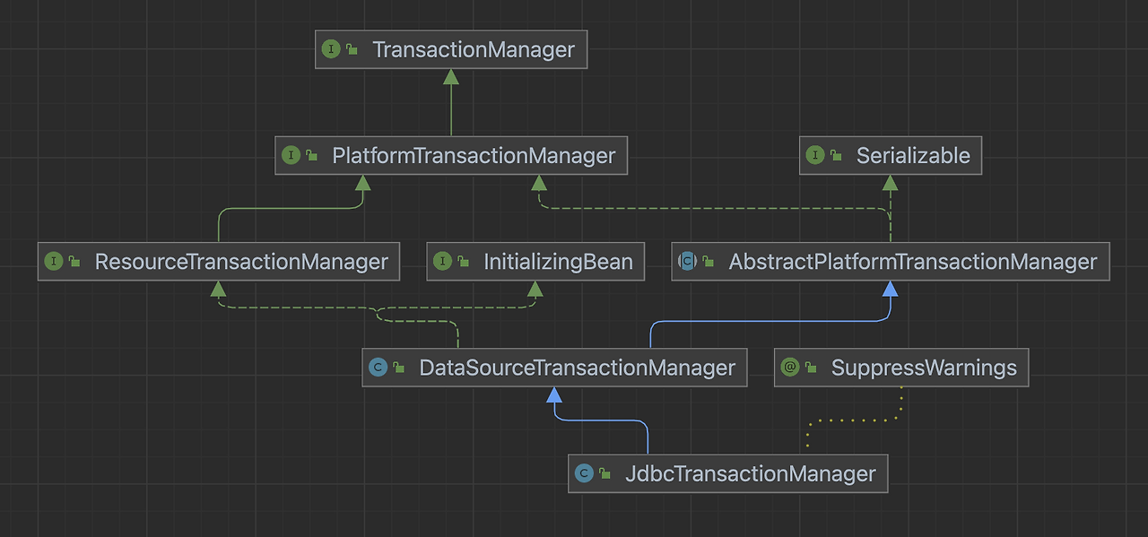 TransactionManager의 상속 계층도는 다음과 같습니다. 이에 대해 조금 더 상세하게 살펴보겠습니다.